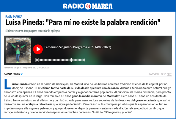 El pasado 14 de mayo nuestra presidenta participó en el programa radiofónico “Femenino Singular” de Radio Marca para presentar junto a María Luisa Pineda de la Losa su libro autobiográfico “Si te quieres, puedes”.